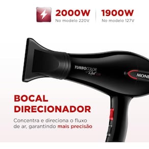 Secador com tecnologia que cuida da saúde dos seus fios! O Turbo Color Red tem revestimento com Tourmaline Íon, mineral que emite íons negativos, reduz o frizz e deixa seu cabelo macio e brilhante. Ainda possui 1.900W de potência para uma secagem super-rápida e eficiente.
