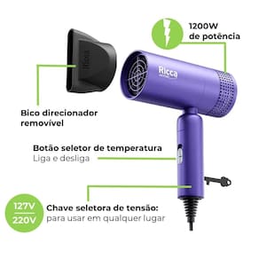 O Secador de Viagem Ricca Air.Port é o aliado perfeito para quem não abre mão de praticidade e cabelos sempre lindos, esteja onde estiver. Leve, compacto e dobrável, ele é ideal para levar na bolsa, na mala ou na mochila, sendo seu companheiro indispensável em viagens. Com potência de 1200W, garante uma secagem rápida e eficiente. Conta ainda com bivolt chaveado, o que permite seu uso em diferentes voltagens sem preocupações. Possui design ergonômico, fácil de manusear, e acompanha um saco exclusivo Ricca, oferecendo ainda mais praticidade na hora de guardar e transportar. Benefícios:• Leve, portátil e dobrável: cabe na bolsa ou mala;• Potência de 1200W: secagem rápida e eficaz;• Bivolt chaveado: segurança e praticidade em qualquer lugar;• Design ergonômico e fácil de usar;• Acompanha saco exclusivo Ricca para transporte;• Ideal para viagens e para quem busca praticidade no dia a dia. Especificações Técnicas:• Potência: 1200W• Bivolt manual (chave seletora)• Cabo dobrável• Acompanha chave para troca de tensão• 2 níveis de velocidade e temperatura Modo de usar:• Escolha a voltagem correta na chave seletora (110V ou 220V).• Ligue o aparelho na tomada.• Selecione a velocidade e temperatura desejada.• Direcione o jato de ar nos cabelos até obter a secagem e o styling ideal.• Após o uso, desligue o secador, espere esfriar e dobre o cabo para guardar no saco Ricca. Sobre a marca: A Ricca está sempre pronta para romper com a mesmice, quebrar padrões e fugir do comum. A marca busca proporcionar felicidade sem se prender a regras, acreditando que esses limites existem para serem superados. • Prático, leve e eficiente! O Secador de Viagem Ricca Air.Port é seu parceiro ideal para ter cabelos incríveis em qualquer lugar!