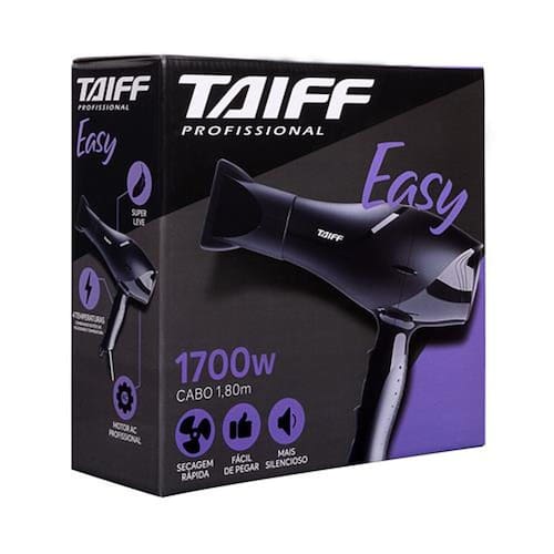 SECADOR DE CABELO TAIFF EASY 1700W 127V Tipo de cabelo Todos os tipos de cabelo Cor PRETO Marca Taiff Material Plástico Dimensões do item C x L x A 21 x 8.7 x 2.1 centímetros Sobre este item Potencia 1700w motor profissional AC Cabo 1, 80m Secagem rapida Facil de pegar Mais silencioso