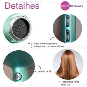 O secador apresenta estrutura compacta e leve, facilitando o manuseio durante o uso. O funcionamento por íons negativos contribui para a distribuição uniforme do calor e para a manutenção da umidade natural dos fios durante a secagem.