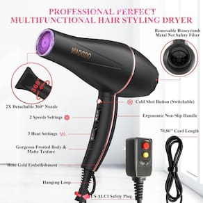 - 🌌: O secador de cabelo adota um potente motor AC que trará um fluxo de ar mais forte para que você possa secar e modelar o cabelo duas vezes mais rápido em menos tempo. Com 3 configurações de aquecimento e 2 de velocidade, você pode escolher a configuração adequada para si mesmo. Com um botão de injeção a frio, você pode usar ar frio para ajudar a modelar os cabelos com facilidade.