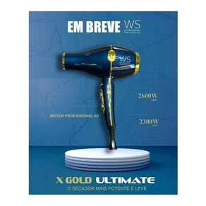Lançamento Secador WS X Gold Ultimate 2600w Azul-PerolaAlta performance, 2 níveis de velocidade, 2 níveis de temperatura.110 2300w220v 2600wMAIOR POTENCIA DO MERCADOPotência e vazão são as características principais do secador X Gold Ultimate, proporcionando um trabalho mais rápido e eficaz. Motor AC Profissional, Mais Tecnologia e Potência. Melhor Desempenho Para Secar, Alisar e Modelar Cabelos.Jato de ar Frio, Acabamento Perfeito e Duradouro do Penteado. Alça para pendurar com 3 metros de cabo, maior facilidade para pendurar e manusear o secador. Conteúdo da embalagem 1 Secador WS X Gold Ultimate 2600W 220V 2 Bicos conectores de ar 1 Manual de instruçõesGarantia de 6 meses