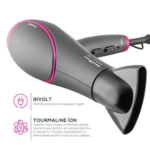 Sua versatilidade bivolt torna ele perfeito para levar a qualquer lugar, garantindo praticidade onde quer que você vá. Equipado com a tecnologia Tourmaline Íons, o Secador de Cabelos Britânia proporciona cabelos mais macios e brilhosos ao fechar as cutículas dos fios e reduzir o frizz, neutralizando a eletricidade estática natural dos cabelos.