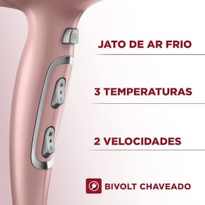Com uma excelente potencia de 2000 W, 3 temperaturas e 2 velocidades, voce consegue secar os seus cabelos com muita facilidade. Alem disso, com a tecnologia Tourmaline Ion, atraves do calor, o mineral emite ions negativos que fecham as cuticulas dos fios e reduzem o frizz.