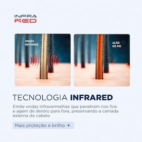 TECNOLOGIA INFRARED: Emite ondas infravermelhas que penetram nos fios e agem de dentro para fora, acelerando a secagem, enquanto preservam a camada externa do cabelo. Garantia de mais proteção e brilho na sua rotina capilar!