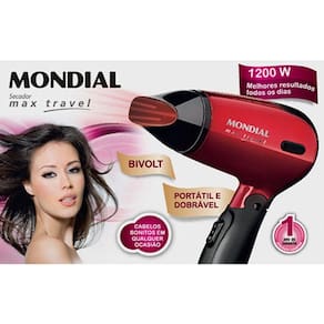 Secador de Cabelos Mondial Max Travel SC-10 BivoltO secador de cabelos Max Travel SC-10 é ideal para você que tem pouco tempo para se arrumar, mas precisa deixar as madeixas em ordem.Agora você pode enxugar e escovar os cabelos em casa ou em qualquer lugar. Leve e portátil, o Max Travel SC-10 cabe na bolsa. Além disso, é muito simples de manusear. Ele conta com duas velocidades, duas temperaturas e bocal concentrador de ar para facilitar a secagem dos fios. Seus cabelos mais bonitos e bem cuidados.Potência e praticidadeMax Travel SC-10 tem 1200 Watts de potência, cabo dobrável e duas velocidades.Informações técnicas:Marca MondialTemperaturas 2 Ajustes de temperaturaVelocidades 2Sistema / Tecnologia Cabo dobrávelPortátil SimVoltagem BivoltPotência (W) 1200WConsumo (KW/h) 1,2Kw/hCor Preto / VermelhoConteúdo da Embalagem 1 Secador, 1 Bocal, 1 Manual de Instruções, 1 Manual de assistência técnicaDimensões aproximadas do produto (cm) - AxLxP 22,2x17,2x7,3cmPeso líq. aproximado do produto (kg) 340gModelo Max Travel SC-10Garantia do Fornecedor 12 meses