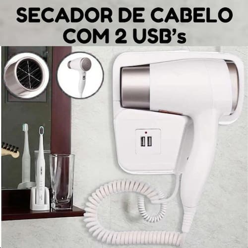 Secador de parede branco usb quente e frio 220v Descrição do anúncio: Adicione sofisticação ao seu banheiro com o secador de cabelo de parede, perfeito para uso em casa ou em ambientes como hotéis, pousadas e spas. Compacto, leve e poderoso, este secador iônico cuida da saúde do seu cabelo, proporcionando um brilho e suavidade excepcionais. Com seu design resistente e funcionalidade avançada, ele é ideal para qualquer tipo de cabelo, seja liso, encaracolado ou ondulado. Conteúdo da embalagem: 1 secador de cabelo de parede 1 cabo espiral de poliuretano extensível até 1,6 metros Manual de instruções Características: Design compacto: fácil de armazenar e ideal para viagens. Funcionalidade iônica: reduz o tempo de secagem e elimina o frizz, proporcionando brilho e suavidade ao cabelo. Resistência: feito para suportar quedas, compressão e altas temperaturas. Ventilação poderosa: baixo nível de ruído e excelente dissipação de calor. Especificações: Potência: 1300w Frequência: 50hz Comprimento do cabo de energia: 70cm Comprimento do cabo do secador: até 1,20m cabo espiral Configurações: 2 ajustes ar frio e quente Material: plástico resistente Cor: branco Dimensões: 24 x 17,5 x 17cm 2x entradas usb Principais perguntas sobre o produto e respostas: 1 este secador é adequado para uso doméstico Sim, ele é ideal tanto para uso doméstico quanto para ambientes comerciais como hotéis e spas. 2 o cabo do secador é resistente Sim, o cabo espiral de poliuretano é altamente resistente, com boa extensibilidade e rápida retração. 3 posso usar este secador em uma tomada comum Sim, ele é compatível com tomadas de 10a. 4 o secador é barulhento Não, ele possui uma ventilação poderosa com baixo nível de ruído. 5 este secador pode ser em cabelos molhados Sim, ele é projetado para secar rapidamente cabelos molhados, mantendo a umidade natural e evitando danos. Marca: Não Informado Ean: 7905276300607