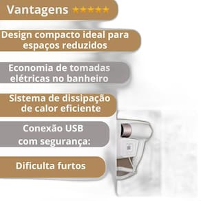 Secador de parede fixo branco quente e frio 110v Descrição do anúncio: Adicione sofisticação ao seu banheiro com o secador de cabelo de parede, perfeito para uso em casa ou em ambientes como hotéis, pousadas e spas. Compacto, leve e poderoso, este secador iônico cuida da saúde do seu cabelo, proporcionando um brilho e suavidade excepcionais. Com seu design resistente e funcionalidade avançada, ele é ideal para qualquer tipo de cabelo, seja liso, encaracolado ou ondulado. Conteúdo da embalagem: 1 secador de cabelo de parede 1 cabo espiral de poliuretano extensível até 1,6 metros Manual de instruções Características: Design compacto: fácil de armazenar e ideal para viagens. Funcionalidade iônica: reduz o tempo de secagem e elimina o frizz, proporcionando brilho e suavidade ao cabelo. Resistência: feito para suportar quedas, compressão e altas temperaturas. Ventilação poderosa: baixo nível de ruído e excelente dissipação de calor. Especificações: Potência: 1300w Frequência: 50hz Comprimento do cabo de energia: 70cm Comprimento do cabo do secador: até 1,20m cabo espiral Configurações: 2 ajustes ar frio e quente Material: plástico resistente Cor: branco Dimensões: 24 x 17,5 x 17cm 2x entradas usb Principais perguntas sobre o produto e respostas: 1 este secador é adequado para uso doméstico Sim, ele é ideal tanto para uso doméstico quanto para ambientes comerciais como hotéis e spas. 2 o cabo do secador é resistente Sim, o cabo espiral de poliuretano é altamente resistente, com boa extensibilidade e rápida retração. 3 posso usar este secador em uma tomada comum Sim, ele é compatível com tomadas de 10a. 4 o secador é barulhento Não, ele possui uma ventilação poderosa com baixo nível de ruído. 5 este secador pode ser em cabelos molhados Sim, ele é projetado para secar rapidamente cabelos molhados, mantendo a umidade natural e evitando danos. Marca: Não Informado Ean: 7905276300331