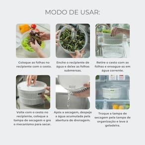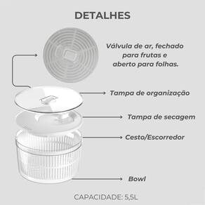 Ampla Capacidade: Com 5,5 litros, é perfeito para preparar grandes porções de salada de uma só vez, ideal para famílias e eventos. Design Transparente: Permite monitorar o processo de secagem, garantindo que suas folhas estejam sempre no ponto ideal. Tampa Segura: Acompanha uma tampa resistente que mantém o conteúdo seguro durante a operação, evitando respingos. Fácil de Usar: Sistema de rotação suave que remove eficientemente o excesso de água com algumas voltas simples. Material Resistente: Fabricado em plástico durável e livre de BPA, assegurando segurança e longevidade. Limpeza Prática: Todas as partes são desmontáveis e laváveis na máquina de lavar louças, facilitando a limpeza. Base Antiderrapante: Proporciona estabilidade durante o uso, evitando deslizes indesejados na bancada. Benefícios: