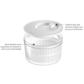 Detalhes: - Tampa com sistema de centrifuga manual, basta rodear o pino e o movimento escorre a água; - Mantém folhas frescas e crocantes por mais tempo; - Higienize e seque as folhas no mesmo lugar; - Remove a água com poucos movimentos; - Saladas sempre prontas para consumo; - Não lavar com materiais abrasivos; - Fabricado em material livre de BPA.
