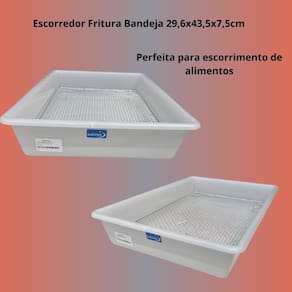 Secador Escorredor Fritura Bandeja 29,6x43,5x7,5cm Salgados A solução ideal para quem busca praticidade, higiene e eficiência no preparo e armazenamento de alimentos A bandeja multiuso em polipropileno de 7,5 litros com a tela grelha escorredora em aço estanhado, proporcionando um conjunto completo para escorrer frituras, armazenar carnes, legumes, frutas e muito mais. Versátil, resistente e seguro para ou doméstico. Ideal para: Escorrer pastéis, batata frita, salgados, coxinhas e frituras em geral Uso em cozinhas industriais, refeitórios, padarias, lanchonetes, food trucks ou residências Resfriamento ou secagem de alimentos Itens Inclusos: 01 Bandeja Branca Multiuso - Capacidade 7,5 Litros 01 Tela Grelha Escorredora em Aço Estanhado Especificações da Bandeja: Material: Polipropileno livre de BPA Cor: Branca Modelo: DF-0737 - Marca Daifpro Comprimento: 43,5 cm Largura: 29,6 cm Altura: 7,5 cm Capacidade: 7,5 Litros Características: Apta para lava-louças Pode ser Utilizado em freezer e micro-ondas Não possui pés dobráveis Especificações da Tela Escorredora: Material: Aço estanhado de alta resistência Modelo: df-25x39 - Marca Daifpro Grelha escorredora Tipo grade Comprimento: 39 cm Largura: 25 cm Altura: 2 cm Diâmetro da trama: 0,6 cm Funções: Escorrer, secar e resfriar alimentos Diferenciais: Estrutura firme, durável e resistente à corrosão