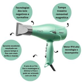 Leve e elegante, o secador Fox 3 Soft Green proporciona muito mais conforto durante o uso sem perder a potência de 2200w. Os íons negativos selam as cutículas dos fios, deixando os cabelos macios e com brilho, e o botão de jato de ar frio fixa a modelagem e diminui o frizz. Sua tampa traseira magnética facilita a limpeza, proporcionando maior durabilidade ao secador. O cabo de 3 metros de comprimento permite ao profissional maior mobilidade.