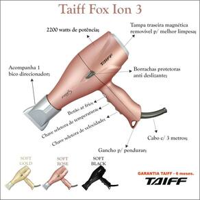 O Secador Fox Ion 3, desenvolvido pela TAIFF, lança cargas de ions negativos nos fios, neutralizando a eletricidade estática. Esses ions dividem as gotas de água dos fios molhados em micropartículas, facilitando sua penetração nos cabelos, deixando-os hidratados e sedosos. Proporcionam também o fechamento da cutícula dos fios, o que permite um melhor reflexo da luz, dando muito mais brilho.