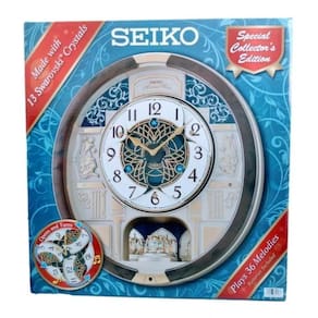 Relógio musical que toca uma das 30 melodias de alta fidelidade a cada hora e sensores de luz garante que ele permaneça quieto no escuro. O pêndulo rotativo adiciona brilho e brilha com cada Cristal Swarovski precisamente colocado .