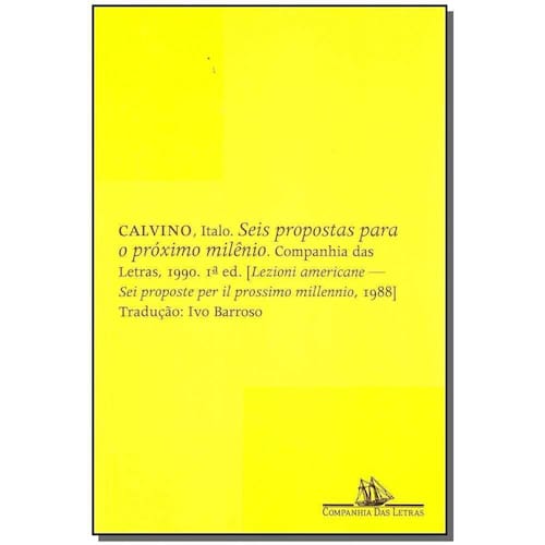 Declaração de ética, mais que de poética, as conferências que Calvino preparou para a Universidade Harvard representam o testamento artístico de um dos protagonistas literários do fim de milênio. Em meio à crise contemporânea da linguagem, cada vez mais aguda, o grande escritor italiano identifica as seis qualidades que apenas a literatura pode salvar - leveza, rapidez, exatidão, visibilidade, multiplicidade, consistência -, virtudes a nortear não apenas a atividade dos escritores mas cada um dos gestos de nossa existência. Feitas de divagações, memórias, trechos autobiográficos, as Seis propostas de Calvino constituem um precioso legado do milênio para as gerações do ano 2000.Prêmio Jabuti 1993 de Melhor Produção Editorial de Obra em Coleção