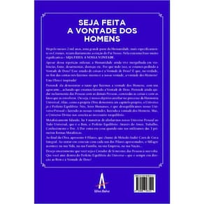 Há pelo menos 2 mil anos uma grande parte da Humanidade, mais especificamente os Cristãos, rezam diariamente a oração do Pai Nosso. Nela está uma frase muito significativa - SEJA FEITA A VOSSA VONTADE. Apesar dessa repetição milenar, a Humanidade ainda vive mergulhada em violências, fome, desarmonias, doenças etc. Porque tudo isso, se estamos pedindo a Vontade de Deus? Esse estado de coisas é a Vontade de Deus? É que na verdade, no fim das contas nós fazemos mesmo é a nossa vontade, a vontade dos Homens! Esta Obra é inspirada! Pretende ela demonstrar o tanto que fazemos a vontade dos Homens, com um agravante... achando que estamos fazendo a Vontade de Deus. Pretende ainda ajudar na harmonia das Pessoas, com as demais Pessoas, com todas as coisas e com os fatos que a envolvem. Ou seja, é nosso objetivo auxiliar no processo da Harmonia Universal. Aliás, como a própria Obra demonstra em capítulo próprio, o Universo já é Perfeito Equilíbrio. Nós Seres Humanos é que desequilibramos nosso Universo Pessoal – fazendo as nossas vontades, fazendo a vontade dos Homens. Mas, o Universo Divino nos concita ao necessário reequilíbrio. Metafisicamente falando há 4 maneiras de alinharmos nosso Universo Pessoal ao Todo Universal, que é o Bem, o Perfeito Equilíbrio: Através do Amor, Trabalho, Conhecimento e Dor. A Dor entra em cena, quando não nos utilizamos das 3 primeiras formas Metafísicas. Ao final da Obra, apresento 4 Pilares, que chamo de Método André Coen de Cura Integral. Ao entrar em conexão com cada um dos Pilares apresentados, o Milagre acontece na sua Vida, na sua Família, na sua Empresa, na sua Nação... Desejo sinceramente que você seja o Curador de Si mesmo, das Pessoas à sua volta. Que você atue dentro do Perfeito Equilíbrio do Universo – que é sempre em direção ao Bem, e à Vontade de Deus!