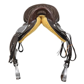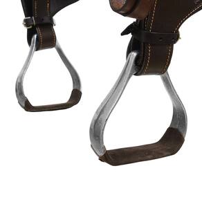 Sela Bronc-Steel modelo Australiana, fabricada em couro cor Marrom com detalhes bordados em Balaio, assento em couro nobuck costurado e acolchoado com tamanho livre de 15", margaridas de metal, armação de fibra de vidro, ferragens em aço inox e suador em lã sintética, completa.