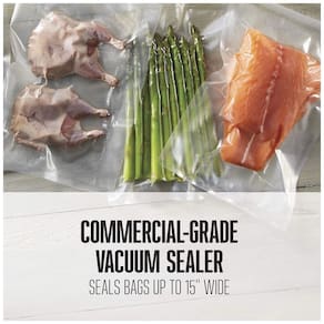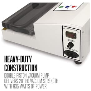 Painel de luz LED com motor refrigerado por ventilador com modo automático para operação com um toque e modo manual. 935 watts 120 volts, 60 Hz. A barra de vedação extra longa com de espessura veda sacos de até . Vácuo rápido e tempo de vedação. A bomba de pistão duplo desenha até Hg de força de vácuo. O selador a vácuo de bancada mantém os alimentos frescos 5 a 6 vezes mais. Modo automático para operação com um toque ou modo manual para um selo personalizado Marca: Não Informado
