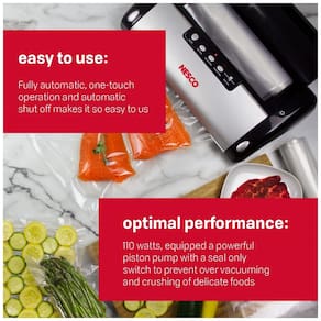 Seladora a vácuo automática com desligamento automático. Possui bomba de pistão com interruptor apenas para vedação, evitando aspiração excessiva e esmagamento de alimentos delicados. Armazenamento e cortador de sacos integrados para criar tamanhos de sacos personalizados.Tipo