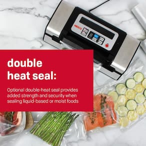 Nesco Seladora a vácuo Deluxe Food VS-12, 130 Watts, kit sacos e tampa de visualização, compacta, prata - Desempenho ideal: 130 watts, 25. 1 bomba de vácuo dupla InHG para desempenho ideal. Garante a máxima extração de ar ao selar alimentos maiores - Configurações variáveis: inclui 3 configurações - seco, úmido e duplo. Além disso, você pode escolher entre pressão normal de vácuo ou suave, para manter alimentos macios seguros - Alça de bloqueio fácil: a alça de bloqueio fácil torna a operação com uma mão suave e fácil - Vedação térmica dupla: a vedação de calor duplo opcional oferece maior resistência e segurança ao selar alimentos à base de líquidos ou úmidos - Armazenamento embutido e cortador de bolsas: armazena convenientemente qualquer marca de sacos seladores a vácuo na unidade, enquanto o cortador de sacos ajuda a criar tamanhos de bolsa personalizados para suas necessidades - Sacos seladores a vácuo incluídos: dois rolos de saco estão incluídos para você começar, um rolo de 21,8 cm x 9,85 pés e um rolo de 11,8 x 9,85 cm