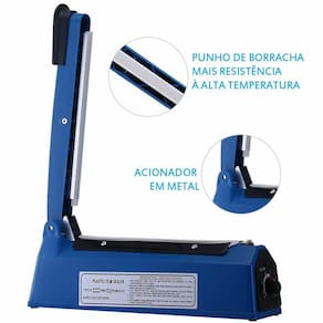 Voltagem: 110v Cor: azul Material: plástico e metal Potência: 150w Espessura máxima de selagem: 0,3mm Largura máxima de selagem: 2mm Comprimento máxima de selagem: 100mm Tempo de aquecimento: 0,2 - 1,5 s Comprimento da selagem: 10cm