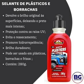 Selante de Plástico e Borrachas 280g Proauto Bem Vindos a nossa Loja Despachamos o mais rápido possível Selante de Plásticos e Borrachas 280g - Proauto -pode ser tanto nas áreas externas como internas; -previne o ressecamento; -proporciona o brilho duradouro; -protege contra os raios UV; -promove hidrorrepelência. Modo de Uso: Aplique algumas gotas do produto em uma esponja e espalhe uniformemente sobre a superfície desejada. Marca: Não Informado Ean: 7897520016429