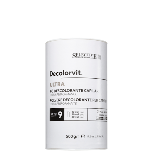 O Pó Descolorante elective Professional Decolorvit Ultra conta com exclusiva tecnologia ”safe salon formula”, com volatilidade zero, ideal para uma ação de ultra performance. Misturado exclusivamente com Decolorvit Active SSe clareia até 9 tons de forma gradual e uniforme. Enriquecido com enzimas especiais e pó de meteorito.