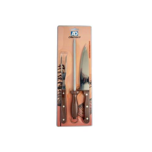Kit Churrasco 3 Pcs Faca/Chaira/Garfo Em Inox E Cabo De Madeira - Ad