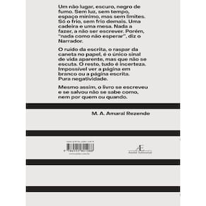 Um não lugar, escuro, negro de fumo. Sem luz, sem tempo, espaço mínimo, mas sem limites. Só o frio, sem frio demais. Uma cadeira e uma mesa. Nada a fazer, a não ser escrever. Porém, “nada como não esperar”, diz o Narrador. O ruído da escrita, o raspar da caneta no papel, é o único sinal de vida aparente, mas que não se escuta. O resto, tudo é incerteza. Impossível ver a página em branco ou a página escrita. Pura negatividade. Mesmo assim, o livro se escreveu e se salvou não se sabe como, nem por quem ou quando. [M. A. Amaral Rezende] “Gostei muito. E tenso e denso. Talvez uma radicalização do Beckett.” [Augusto de Campos] Projeto Gráfico: Casa Rex [Gustavo Piqueira]