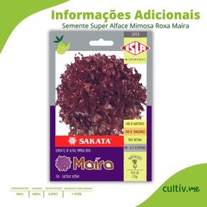 Características * Variedade: Alface Mimosa Roxa Maíra * Cor das Flores: Amarelo * Cor das Folhas: Roxo intenso * Formato: Folhas soltas, rendadas e macias * Ciclo Anual: Anual * Ciclo de Verão: 65 – 70 dias * Exposição solar: Mínimo 3 horas de sol por dia * Germinação: 4 a 7 dias * Transplante: Após o desbaste das mudas * Colheita: Aproximadamente 65 a 70 dias após o plantio * Peso médio da cabeça: 500 g * Sementes livres de transgênicos e agrotóxicos * 100% natural e de alto desempenho * Quantidade de Sementes por grama: 1236 * Renascem: RS-05567/2019