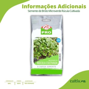 Descrição * Nome Científico: Eruca sativa * Sabor Intenso: se destaca por seu sabor marcante e o toque amargo característicos da erva, mas de forma equilibrada; * Textura Crocante: possuem uma textura surpreendentemente crocante e suculenta; * Colheita rapida e nutritiva: É uma das variedades de microverdes de cultivo mais rápido e fácil; * Fonte de nutrientes: ricos em vitaminas, além de minerais como cálcio e ferro; * Uso: Ideal para saladas, sanduíches gourmet, wraps, finalização de pizzas e massas. Seu sabor intenso harmoniza perfeitamente com carnes vermelhas, queijos e frutas secas.