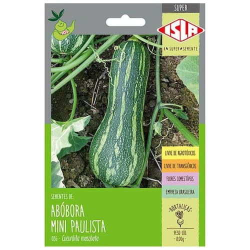 Características * Apresentação da Semente: Nua * Cor da Casca: Verde Escuro Rajado * Cor das Flores: Amarelo * Cor das Folhas: Verde * Cor da Polpa: Laranja * Formato: Cilíndrica * Tipo das Folhas: Geral Grande, Palmada e Pubescente * Produto: Frutos * Ciclo Anual: Anual * Ciclo de Verão: 100 * Comprimento ou Altura: 17 – 20 cm * Diâmetro: 9 – 12 cm * Peso: 0,8 – 1,2 Kg * Espaçamento Entre as Linhas: 200 cm * Espaçamento entre as Plantas: 200 cm * PH do Solo: 5,5 a 6,8 * Temperatura Ambiente: 20 a 30 * Temperatura Solo: 25 a 30 * Inscrição no RENASEM nº RS-00342/2005