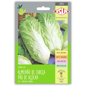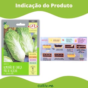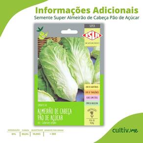 Características * Variedade: Almeirão de Cabeça Pão de Açúcar * Nome científico: Cichorium intybus * Cor das Folhas: Verde-claro * Formato: Cabeça compacta e folhas alongadas * Ciclo Anual: Anual * Ciclo de Verão: 100 dias * Exposição solar: Mínimo 3 horas de sol por dia * Germinação: 5 a 14 dias * Transplante: Após o desbaste das mudas mais altas * Colheita: Aproximadamente 100 dias após o plantio * Altura média da cabeça: 20 – 30 cm * Sementes livres de transgênicos e agrotóxicos * 100% natural e de alto desempenho * Quantidade de Sementes por grama: 593 * Renascem: RS-05567/2019