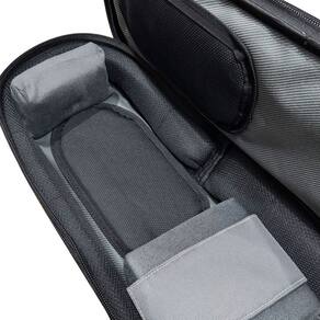 Uma camada de plástico polietileno(PE) entre as partes da BAG para gerar a resistência SEMI RIGIDAAlças tipo mochila ajustáveis + alça de mão acolchoada para transporte confortávelForração interna acolchoada e reforçada para maior segurança do instrumento