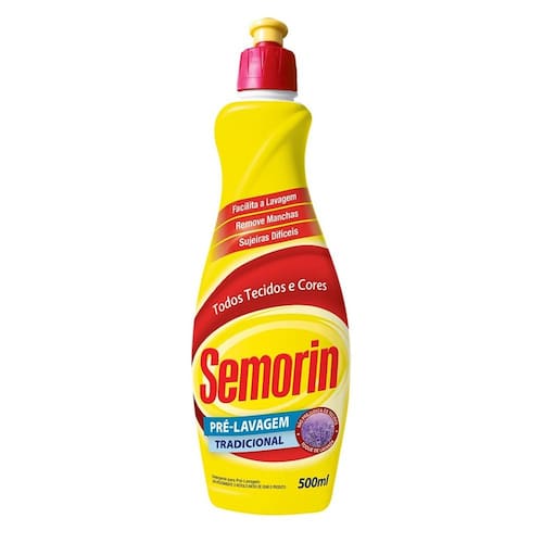 O pré lavagem semorin atua principalmente como um preparo para lavagem, eliminando a necessidade do molho prolongado. Além de remover manchas, age facilitando a lavagem. É extremamente eficaz para sujeiras difíceis e encardidas, como por exemplo: barro, suor, molhos, gorduras, roupas muito sujas, bolor, etc. Basta aplicar diretamente no tecido, esfregando rapidamente e depois lavar normalmente, eliminando a necessidade de longos pré-tratamentos para lavagem. Possui exclusivo bico aplicador que direciona o produto diretamente na sujeira - ótimo para punhos, golas, colarinhos e locais de difícil acesso na peça. Perfeito também para roupas de crianças, toalhas de mesa, panos de prato, guardanapos, jeans, meias, etc. Deixa um suave perfume de limpeza e não prejudica os tecidos ou as cores das roupas brancas e coloridas Não contém cloro.