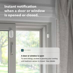 - Notificações em tempo real sempre que uma porta ou janela é aberta ou fechada por meio do aplicativo ecobee Quando combinado com o termostato inteligente ecobee Premium, ele pode tocar uma campainha quando o seu SmartSensor para portas e janelas é aberto, para maior tranquilidade. Não é necessária nenhuma subscrição de segurança inteligente para utilizar esta funcionalidade.