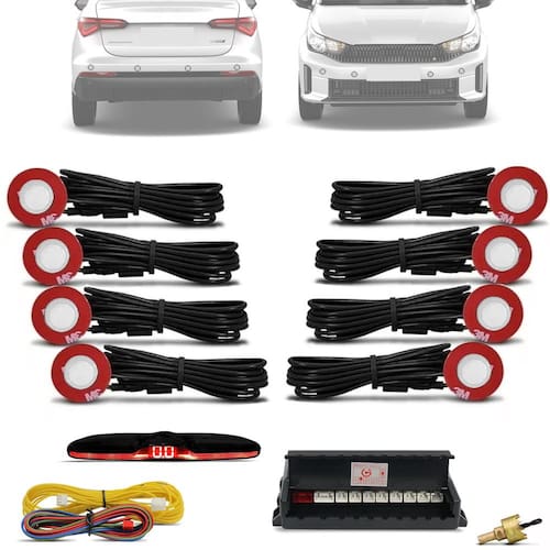 Modelos discretos embutidos no parachoque do automóvel, o acessório possui 8 pontos sensíveis à obstáculos, sendo 4 para parte frontal e 4 para parte traseira. sendo necessário realizar pequenos furos de 16,5mm no mesmo para sua fixação.