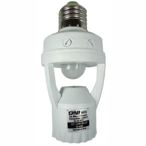Acende a lâmpada automaticamente ao detectar o movimento de pessoas. Possui fotocélula, que pode ser ajustada para que o sensor funcione apenas à noite ou durante todo o tempo.