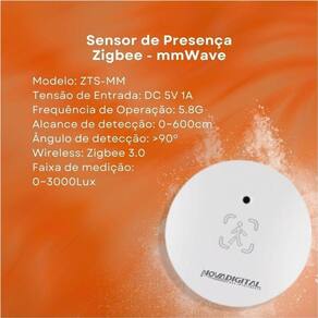 Sensor de presença humana Zigbee - mmWave NovaDigital Maximize a eficiência energética e segurança do seu ambiente com o Sensor de Presença Humana da NovaDigital Este sensor inovador, desenvolvido pela NovaDigital, é a solução ideal para automação residencial e empresarial. Com tecnologia Zigbee e mmWave, garante detecção precisa de movimentos, proporcionando maior comodidade e controle de iluminação, climatização e outros dispositivos conectados. Diferenciais: Tecnologia avançada: O Sensor de Presença Humana Zigbee da NovaDigital utiliza ondas milimétricas para identificação precisa de presença, garantindo segurança e eficiência. Integração inteligente: Possibilita a integração com outros dispositivos IoT, ampliando as funcionalidades de automação. Design discreto: Com dimensões compactas, pode ser facilmente instalado em qualquer ambiente, sem interferir na estética do local. Mais sobre o Produto: Detecção de presença humana: Detecta movimentos e presença, acionando dispositivos conectados automaticamente. Eficiência energética: Permite programar o funcionamento de aparelhos conforme a presença de pessoas no ambiente, otimizando o consumo de energia. Segurança: Contribui para o monitoramento e segurança do ambiente, ativando alarmes ou câmeras em caso de detecção de movimentos suspeitos. Dicas de Uso: Instalação estratégica: Posicione o sensor em locais estratégicos para garantir uma detecção eficiente de presença. Programação inteligente: Utilize a integração com o HUB Zigbee para criar cenários personalizados conforme suas necessidades. Manutenção regular: Mantenha o sensor limpo e sem obstruções para assegurar o funcionamento correto. Ficha Técnica: Marca: NovaDigital Modelo: Sensor de Presença Humana Zigbee - mmWave NovaDigital Tecnologia: Zigbee e mmWave Dimensões: Conforme especificações do fabricante Aplicativos: JWCOM, Ekaza, Android, Tuya, Smart Life e NovaDigital. : 12 meses contra defeitos de fabricação da NovaDigital. Observação: é importante ter uma rede Wi-Fi 2,4GHz com boa capacidade para gerenciar os dispositivos de forma eficaz. Instabilidades na conexão podem interferir na resposta aos comandos via aplicativo e assistentes de voz, e na execução de rotinas automáticas. Recomenda-se consultar um técnico da operadora para garantir uma conexão estável. ATENÇÃO: Este produto necessita da utilização do HUB ZIGBEE para funcionar corretamente. Homologação Anatel: 149822010251 Marca: Não Informado Ean: 7891765867501