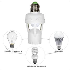 Soquete: E27 Compatibilidade: lâmpadas incandescentes, fluorescentes e LED Potência máxima suportada: até 60 W Tensão: 110–220 V (bivolt automático) Frequência: 50–60 Hz Cobertura: 360° Alcance de detecção: até 6 m (instalado a 3 m de altura) Tempo de acionamento: 60 s (variação de ± 5 s) Fotocélula: opera em ambiente escuro (nível de luz ambiente inferior a ~5 lúmens, conforme especificação) Consumo próprio: < 0,4 W Instalação: vertical ou horizontal