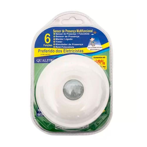 Sensor de Presença Multifuncional, Ambiente Interno,bivolt, Lente 360o, Modelo Embutir e Sobrepor no Gesso. Funciona Com Qualquer Tipo de Lâmpada. a Fotocélula Serve para Diferenciar Dia/noite, Economizando Energia.Possui 6 Funções:1- Sensor de Presença + Fotocélula2- Sensor de Presença3- Manter Ligado4- Timer5- Simulador de Presença6- Relé Fotocélula