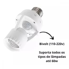 Especificação técnica: -voltagem universal: 110V - 220V Bivolt automatico -ângulo de detecção 360 -frequencia 60Hz -tipos de lâmpada Incandescentes econômicas LEDs e fluorescentes compactas -lampadas incandescentes suporta ate 60 W -suporta lampadas de ate 9W em LED -fluorescentes suporta lampadas de ate 18W -tipo de bocal E27 -alcançe: 23,5m -regulagem de tempo: 30, 60, 120, 240 ou 300 segundos -possui LED indicador de funcionamento que pisca a cada 0,5 segundos por detecção