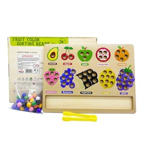 Explore o universo das frutas com o SEPARA FRUTINHAS! Este brinquedo educativo traz uma placa de madeira com recortes em forma de frutas e bolinhas coloridas que representam cada fruta. Inclui uma pinça plástica para estimular habilidades motoras e sensoriais.
