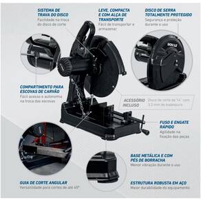 Marca: Schulz. Referência: 929.0106-0 110V / 929.0107-0 220V Potência: 2000W. Rotação: 3800 RPM. Diâmetro do Disco: 14". Uso ideal para cortes em materiais ferrosos, como barras, perfis, tubos, esquadrias e vergalhões. Estrutura robusta em aço.