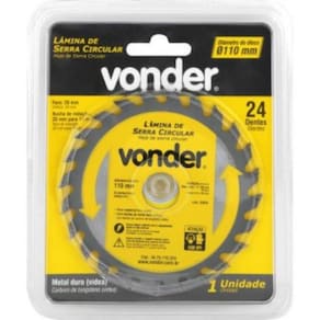 Serra Circular Videa 110x20x24D Vonder 1 Lâmina de serra circular. Indicada para cortar madeiras. Nunca exceder a rotação máxima rpm - risco de acidente e/ou queima da lâmina. Não cortar madeiras impregnadas com massa ou cimento. Para cortes em MDF, a vida útil da serra e o nível de qualidade do acabamento serão reduzidos. A Vonder disponibiliza em seu mix, serras apropriadas para cortes em MDF.Corpo em aço carbono com dentes de metal duro/vídea que proporcionam maior vida útil Marca: Vonder Diâmetro da lâmina de serra circular:4.3/8 - 110 mmNúmero de dentes da lâmina de serra circular:24 dentesEspessura de corte da lâmina de serra circular:2,6 mmEspessura do corpo da lâmina de serra circular:1,5 mmDiâmetro do furo da lâmina de serra circular:20 mmRotação máxima da serra circular rpm :12.100/minVelocidade periférica máx. :70 m/sTamanho da bucha de redução:De 20 mm para 16 mmImagem meramente ilustrativa