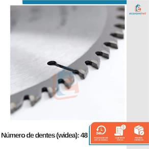 Especificações Técnicas: Material: Aço Carbono e Metal Duro Medidas: 184mm - 7.1/4” Número de dentes (widea): 48 Diâmetro do furo: 20mm Limite máximo: 8000 rpm - 80 m/s Acompanha bucha de redução Marca: Starfer Ref.: 12810040