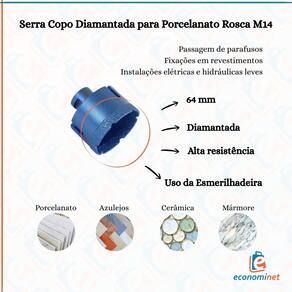 Características Técnicas Diâmetro: 64 mm Tipo de corte: Diamantado Encaixe: Rosca M14 Equipamento compatível: Esmerilhadeira Material do corpo: Aço Marca: Starfer Código Interno: 13006865