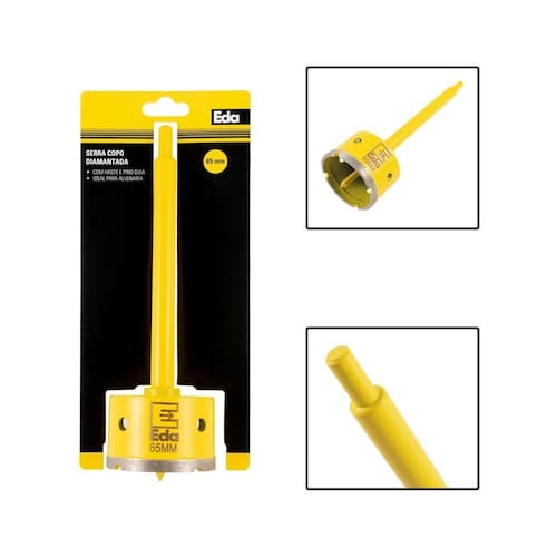 Especificações: - Marca: EDA; - Modelo: 0TL; - Material: Aço e Pó de Diamante; - Aplicação: Para o uso em esmerilhadeiras, indicado para vidro, cristal, cerâmica, azulejo e porcelanato; - Diâmetro: 65mm; - Comprimento da haste 170mm; - Diâmetro do encaixe da haste no mandril: 8,8mm; - Altura externa do copo: 47mm; - Altura da borda diamantada: 7mm; - Espessura do copo: 3,5mm; - Peso: 0,448 Kg;