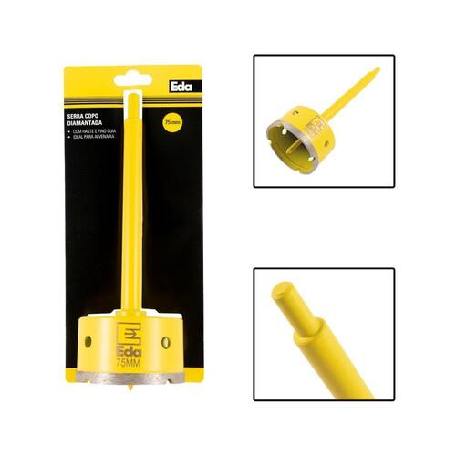 Especificações: - Marca: EDA; - Modelo: 0TN; - Material: Aço e Pó de Diamante; - Aplicação: Para o uso em esmerilhadeiras, indicado para vidro, cristal, cerâmica, azulejo e porcelanato; - Diâmetro: 75mm; - Comprimento da haste 170mm; - Diâmetro do encaixe da haste no mandril: 8,8mm; - Altura externa do copo: 47mm; - Altura da borda diamantada: 7mm; - Espessura do copo: 3,5mm; - Peso: 0,500 Kg;