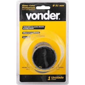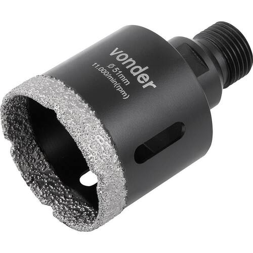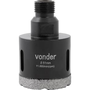 Ref. Fornecedor: 3617200051Marca: VonderConteúdo Embalagem:1 Serra copoDestaques e diferenciais:Corte a seco. Permite a realização de furos com grandes diâmetros em tempo reduzidoAplicações e dicas de uso:Serra copo diamantada para uso em telhas, tijolos, cerâmicas, azulejos, granito, mármore. Indicada para uso em esmerilhadeira com rosca interna M14 e rosca externa 1/2 BSP para máquinas estacionárias em marmorariaCaracterísticas Técnicas:Diâmetro da serra copo: 51 mm Altura útil aproximada da serra copo: 47 mm Comprimento total: 80,0 Diâmetro e tipo da rosca: M14 Rotação máxima rpm : 11000 /min Ean: 7893946647773